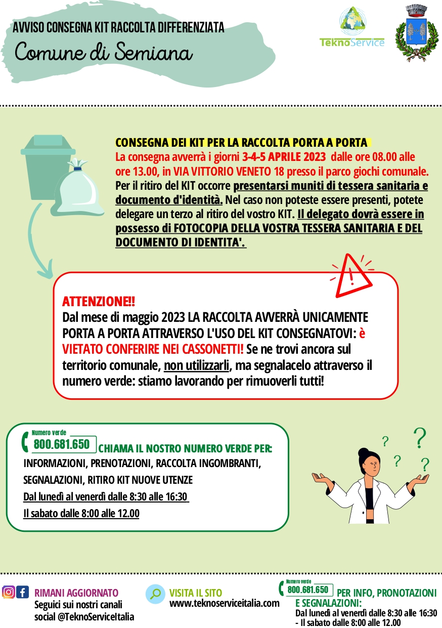 In allegato il volantino contenente le modalità relative alla distribuzione del KIT PER LA RACCOLTA RIFIUTI "PORTA A PORTA" da parte del nuovo gestore TEKNOSERVICE SRL